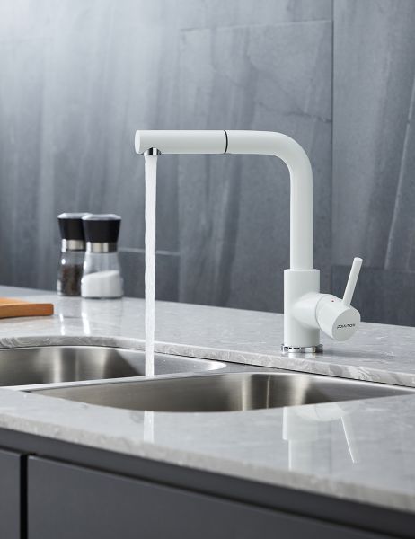 Смеситель для кухни с выдвижным шлангом, Ka214311-431TWИзготовлен из высококачественной латуни, которая отвечает высочайшим европейским стандартам качества, не содержит свинца, не разрушается со временем и безопасна для здоровья.Вытяжной шланг