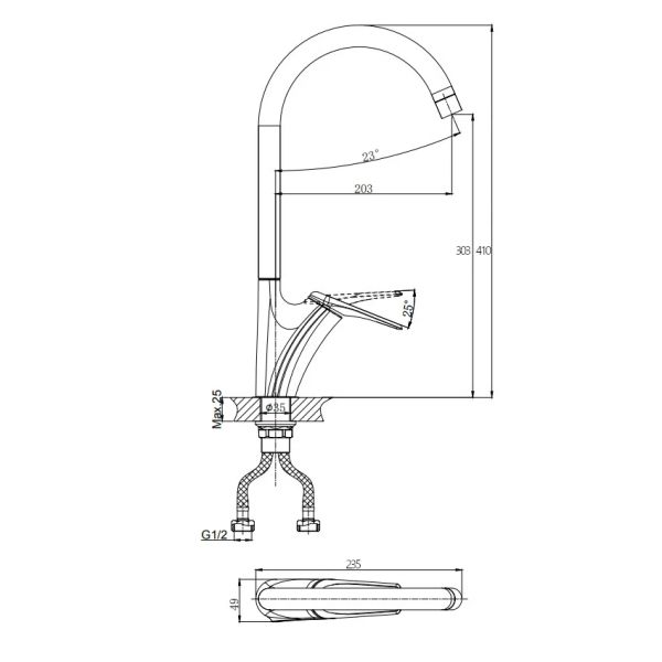 Смеситель для кухни RUSH арт. NE1735-22Black с поворотным изливом с металлической ручкой из коллекции Nevis изготовлен из высококачественной латуни и имеет рычажное управление. В смеситель установлен картридж D-35 с керамическими пластинами. Высота смесителя 410 мм. Излив поворотный 203 мм. Высота излива до аэратора 308 мм. Аэратор изготовлен из пластика с нержавеющим корпусом, угол наклона -23 гр. В комплекте гибкая подводка с латунными гайками 40см - 2 шт., универсальная присоединительная группа для установки на горизонтальную поверхность, фум-лента, индивидуальный пакет, паспорт, гарантийный талон.