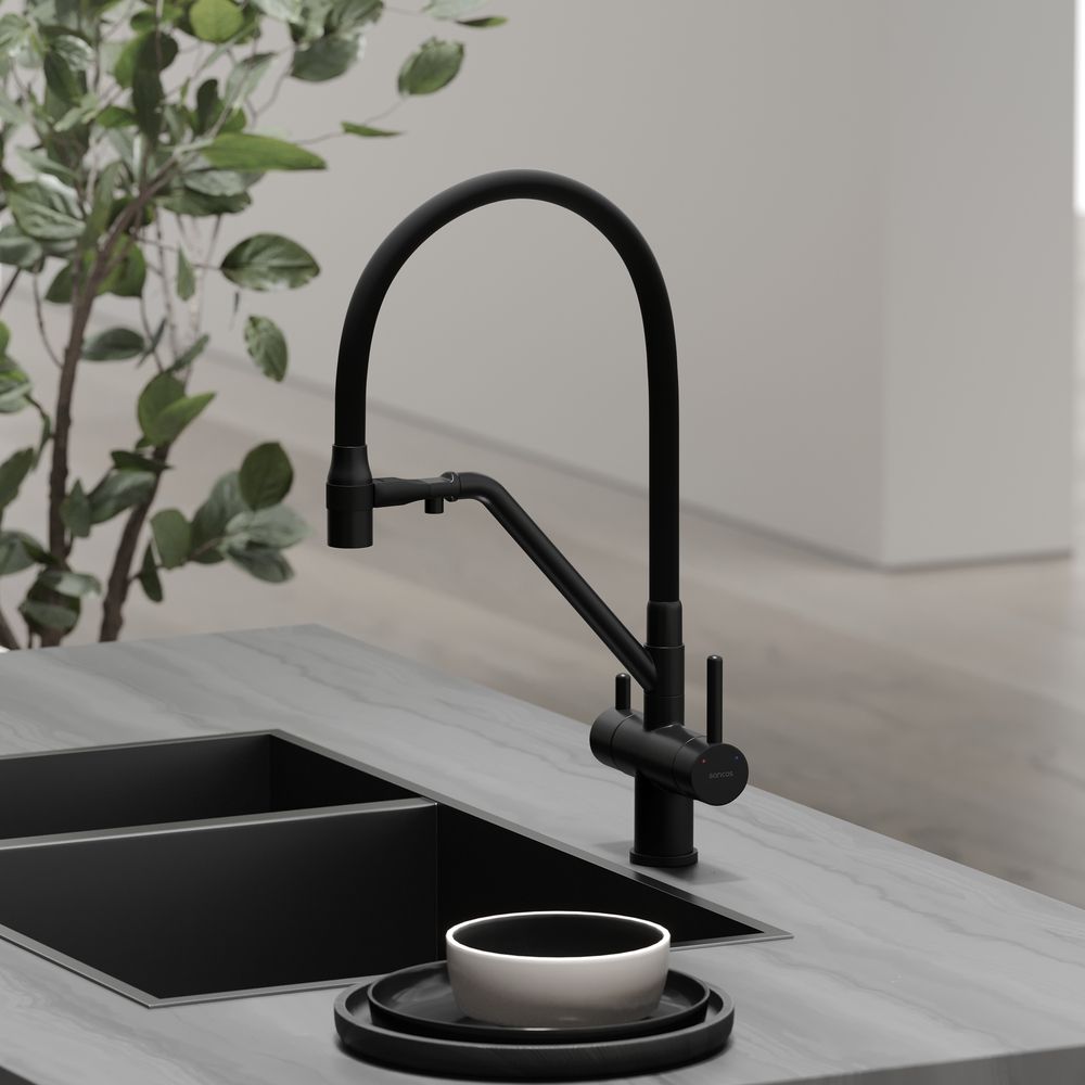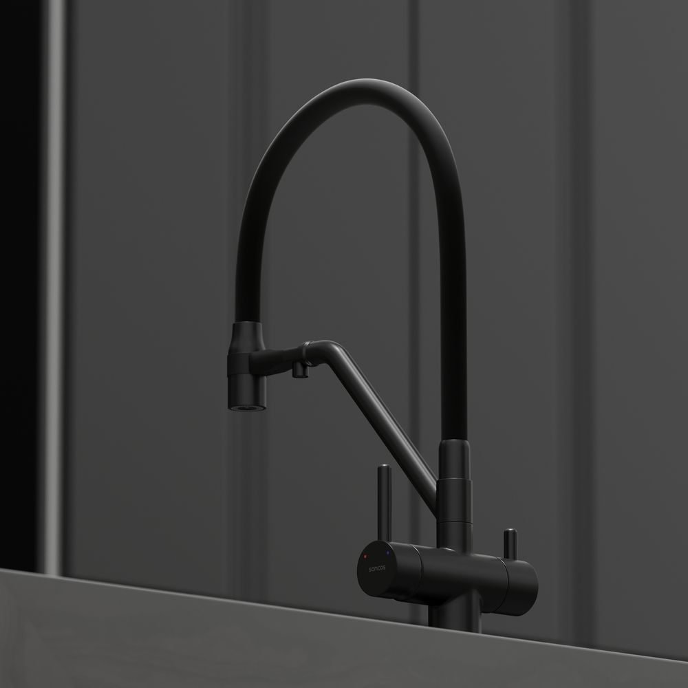 Смеситель для кухни SANCOS Dora с гибким изливом и возможностью подключения фильтра для воды, цвет матовый черный, арт. SC4003MBС возможностью регулировки температуры водыАэратор, гибкая подводка, ключ и крепления для монтажа, ключ для обслуживания аэратора