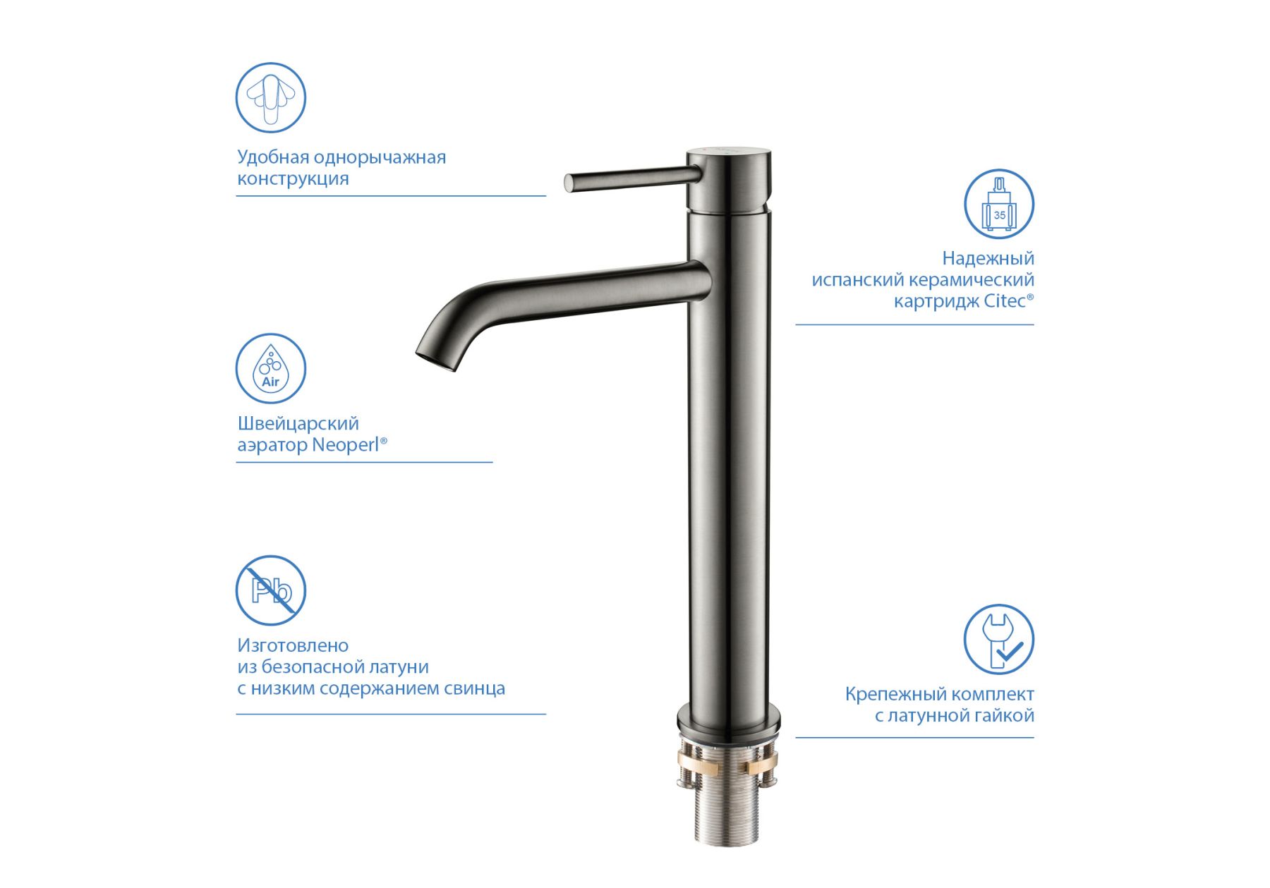 Высота излива (см): 21,4Длина излива (см): 16,6Аэратор: Neoperl, ШвейцарияГибкая подводка в комплектеДлина гибкой подводки (см): 60Тип резьбового соединения: M10Стандарт подводки: 1/2"Вращение излива: фиксированныйТип управления: рычажныйНазначение: для раковиныКоличество монтажных отверстий: 1 отверстиеПодключение к системе водоснабжения: гибкая подводкаМеханизм: керамический картридж Citec, ИспанияДиаметр картриджа (мм): 35