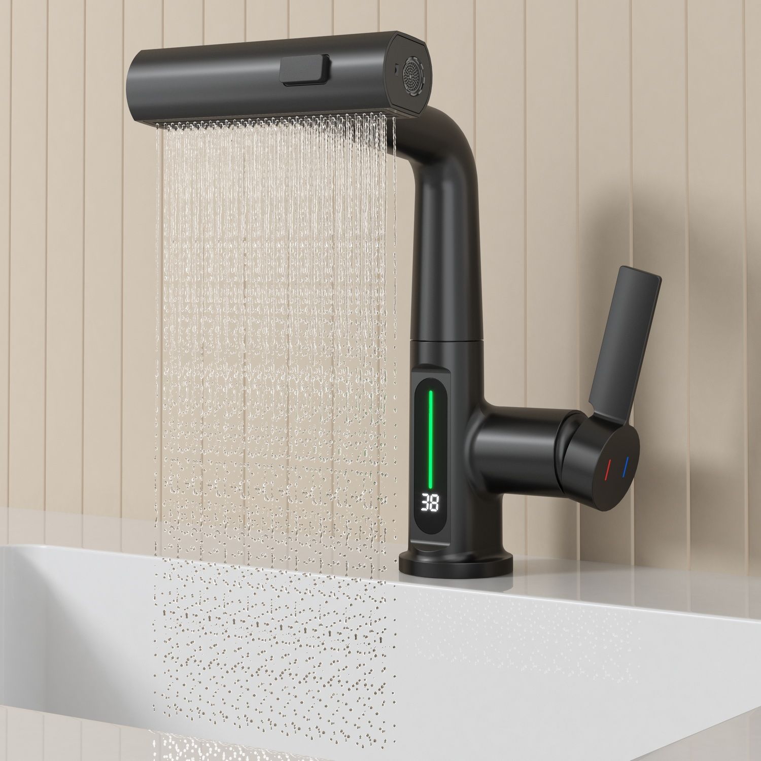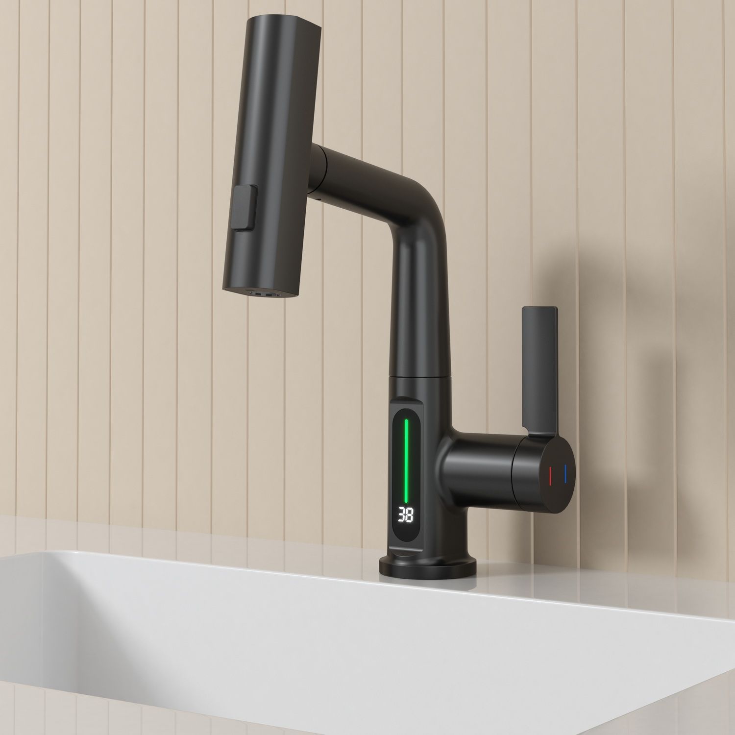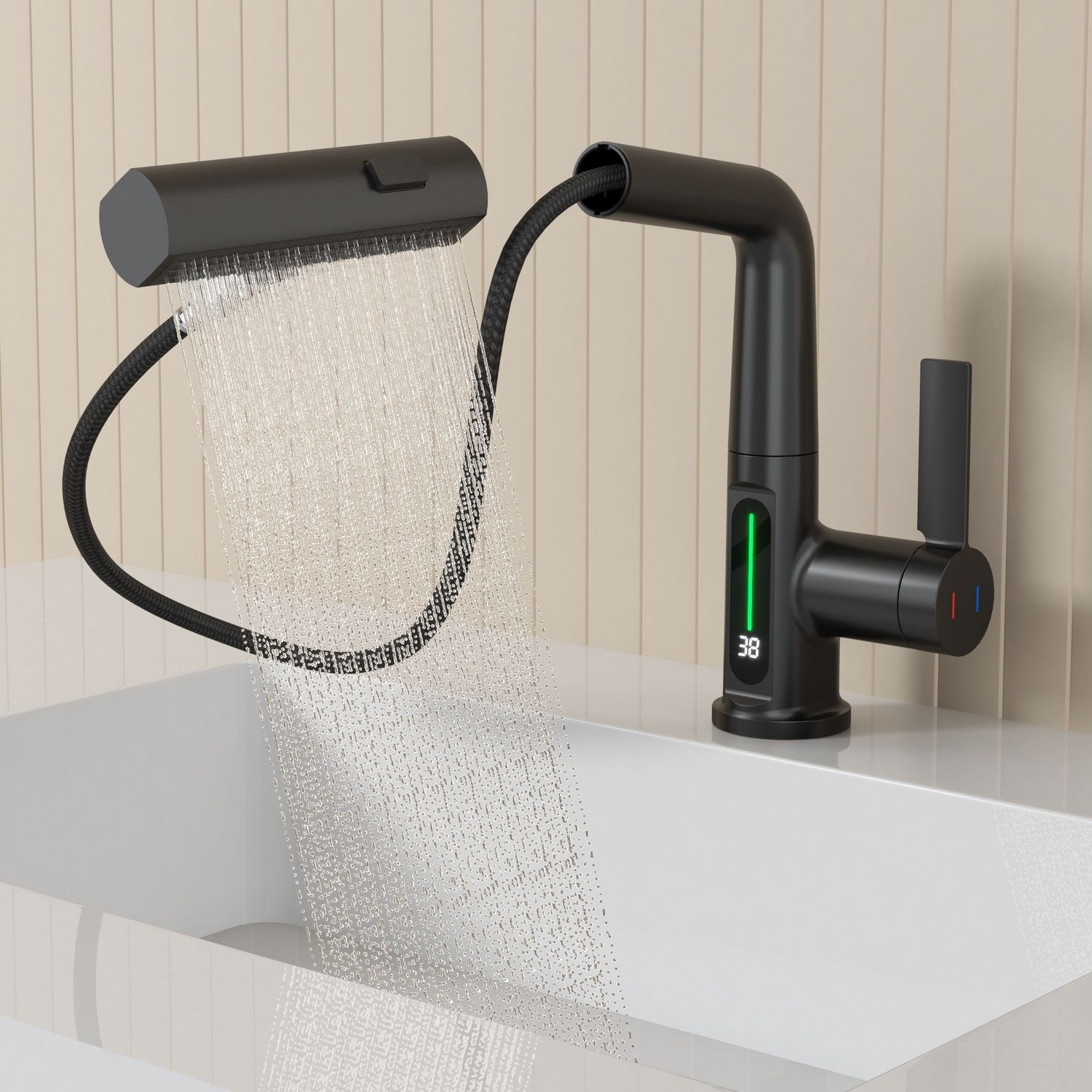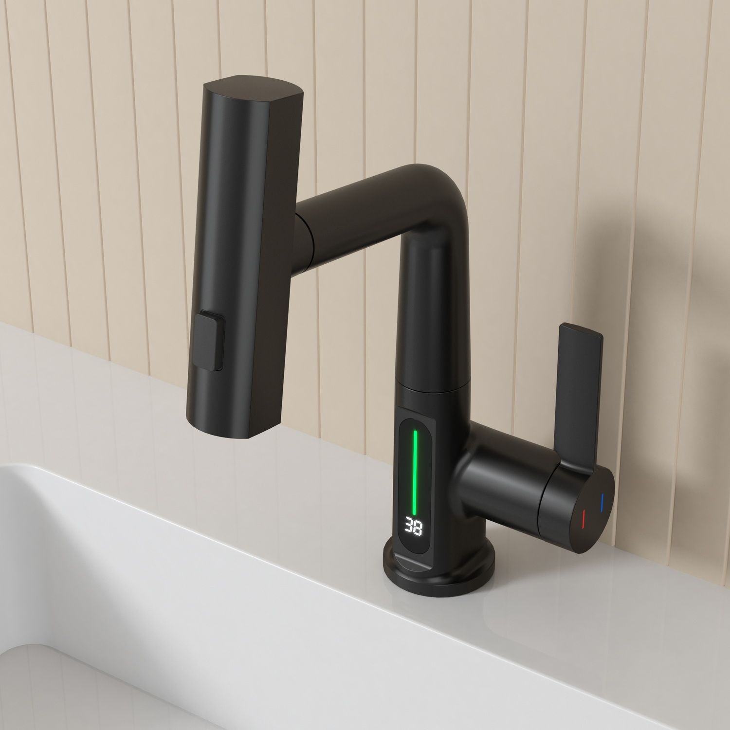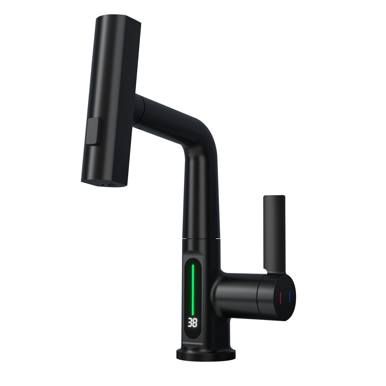 Смеситель для раковины датского производителя Black&White в черном матовом цвете. Корпус изделия выполнен из сантехнической латуни для увеличенного запаса прочности, а также исключает возможность появление коррозии. Управление потоком воды осуществляется с помощью керамического картриджа повышенной пропускной способности. Инновационным решением можно отметить электронное табло, расположенное в нижней части корпуса, на которое выводится показание температуры воды с подсветкой красного, зеленого и синего цвета. В данном продукте реализован многофункциональный излив с возможностью настройки высоты и длинны с помощью вытяжного шланга. Аэратор смесителя оборудован несколькими видами подачи воды, которые переключаются с помощью кнопки расположенной сверху корпуса.