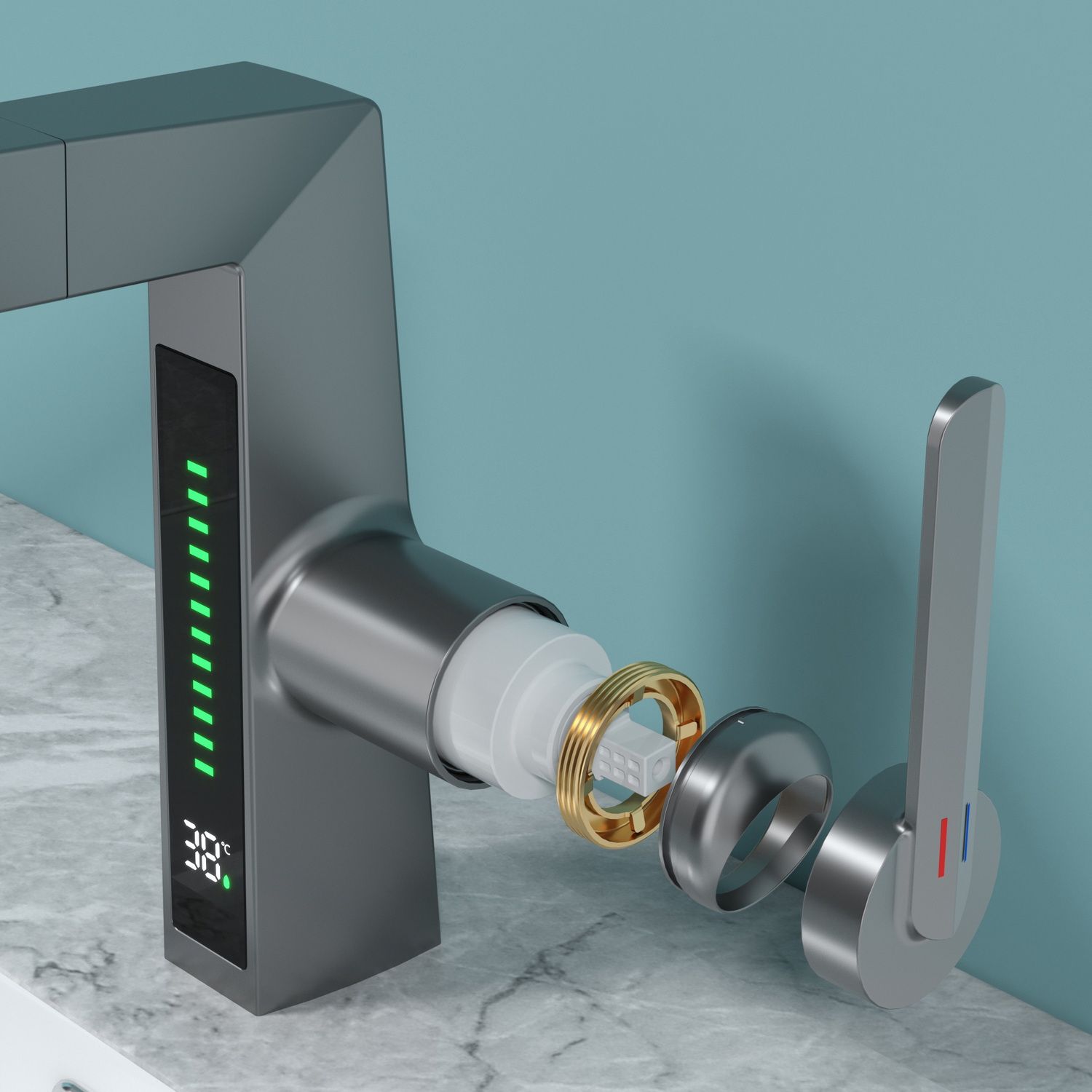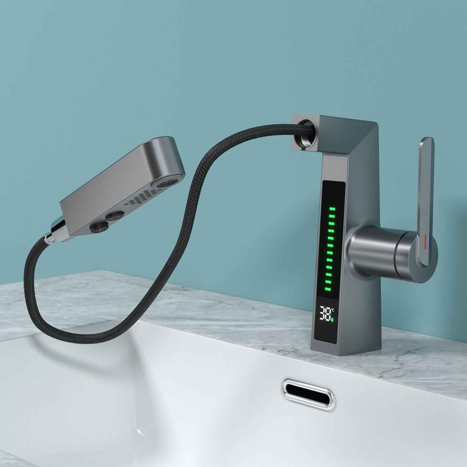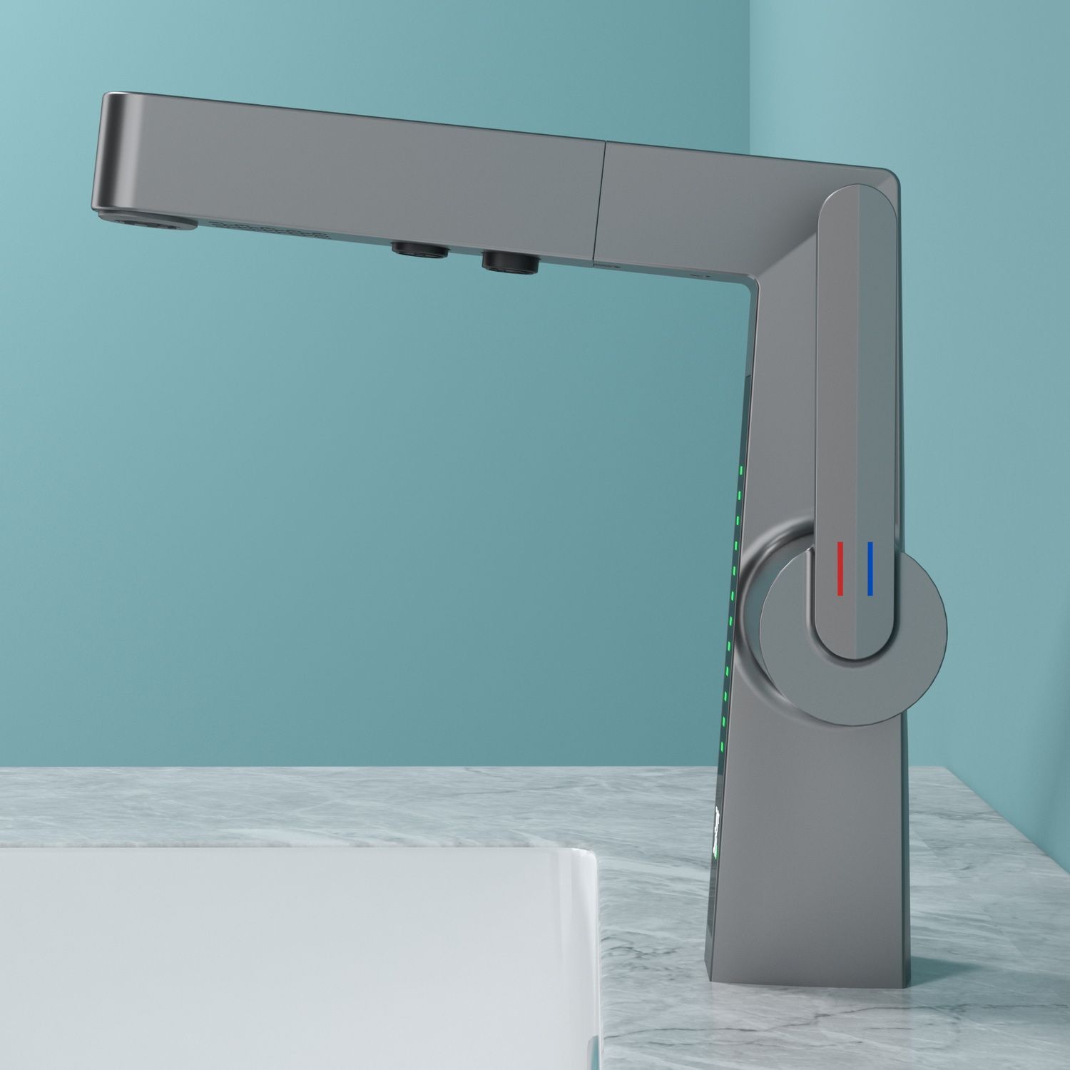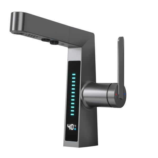 Смеситель датского производителя Black&White в цвете оружейная сталь. Изделие реализовано в минималистичном дизайне и изготовлено из сантехнической латуни, что увеличивает срок службы и исключает возможность появления коррозии. В нижней части корпуса расположен дисплей с показаниями температуры воды с соответствующей подсветкой температурного режима. Для его работы не требуется электричество- он работает от машины постоянного тока, при прохождении через него потоков воды. Управление происходит через керамический картридж большой пропускной способности. Важным функциональным элементом можно отметить вытяжной излив с поворотным аэратором, на котором также дополнительно есть функция изменения поток воды.