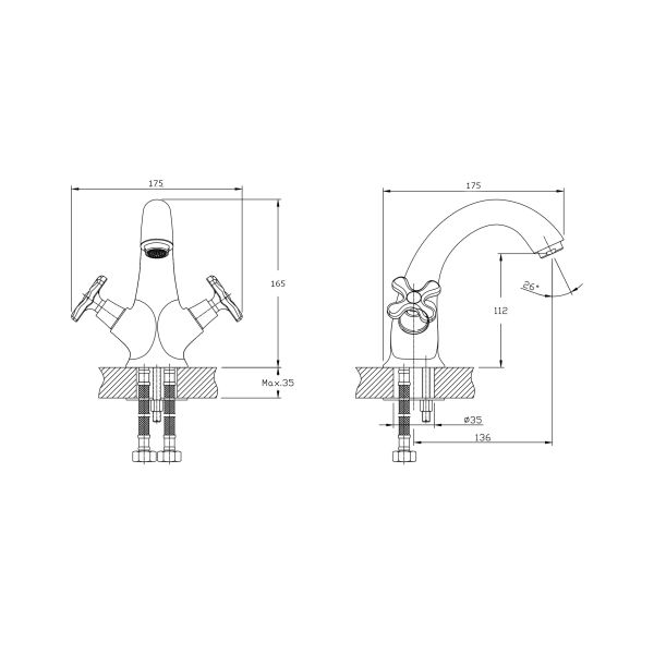 Смеситель для раковины RUSH арт. SA5350-11 с металлической ручкой из коллекции Sakhaline изготовлен из высококачественной латуни и имеет вентильное управление.В смеситель установлены кран-буксы (RSH502) с керамическими пластинами. Высота смесителя 165 мм. Излив литой неповоротный 136 мм. Высота излива до аэратора 112 мм. Аэратор изготовлен из пластика с нержавеющим корпусом, угол наклона - 26 гр. В комплекте универсальная присоединительная группа (шпилька-2шт), гибкая подводка с латунными гайками 35см - 2шт, фум-лента, индивидуальный пакет, паспорт, гарантийный талон.