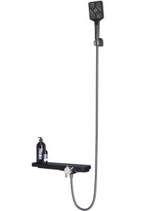 В футуристическом дизайне: корпус изделий выполнен в виде вместительной и удобной полки для душевых принадлежностей, а наличие удлиненного поворотного излива с шарнирным соединением позволяет регулировать направление воды, для максимального комфорта в процессе использования.