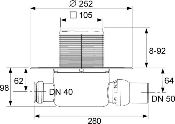 Декоративная решетка, нержавеющая сталь, 100 х 100 мм • Монтажный элемент • Решетка для волос • Стакан гидрозатвора с мембраной • Гидроизоляционная манжета Seal System, 480 х 480 мм • Сифон пластиковый (PP) c горизонтальным поворотным отводом DN 50 и горизонтальным прямым входом DN 40 с заглушкой; -- высота гидрозатвора = 50 мм; -- производительность (согласно DIN EN 1253) при уровне воды над решеткой 10/20 мм: при минимальной высоте монтажа решетки – 0,52/0,89 л/с; при максимальной высоте монтажа решетки – 0,64/1,35 л/с. • Комплект опор со звукоизолирующими прокладками