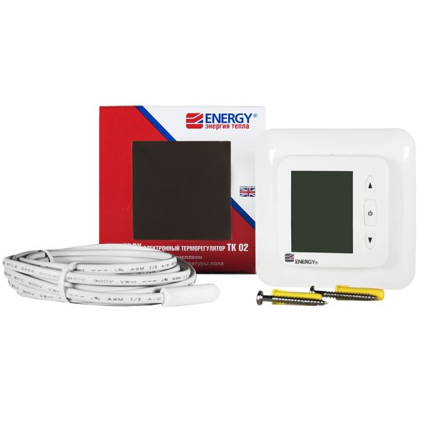 Электронный терморегулятор с выносным термодатчиком и большим жидкокристаллическим дисплеем Energy TK02 устанавливается в стандартную электромонтажную коробку. Размеры терморегулятора соответствуют размерам выключателя «евростандарт», поэтому он может использоваться в стандартных единых монтажных рамках совместно с другими выключателями.Температура регулируется в диапазоне +5°С - +40°С. Термостат управляется тремя кнопками, находящимися на лицевой части прибора. Информация о режиме работы и текущей температуре отображается на жидкокристаллическом дисплее. Одновременно с нажатием кнопки включается оранжевая подсветка, что позволяет настраивать устройство даже в темном помещении.Благодаря высокой точности установки температуры существенно сокращается время работы тепловой системы, как следствие, снижаются расходы на потребляемую электроэнергию.Термостат Energy TK02 подходит для любых систем электрического отопления внутри помещений. Защита корпуса терморегулятора от конденсата (IP 21) допускает установку даже во влажные помещения. Также предусмотрено автоматическое отключение нагревательной секции в случае выхода датчика температуры пола из строя.