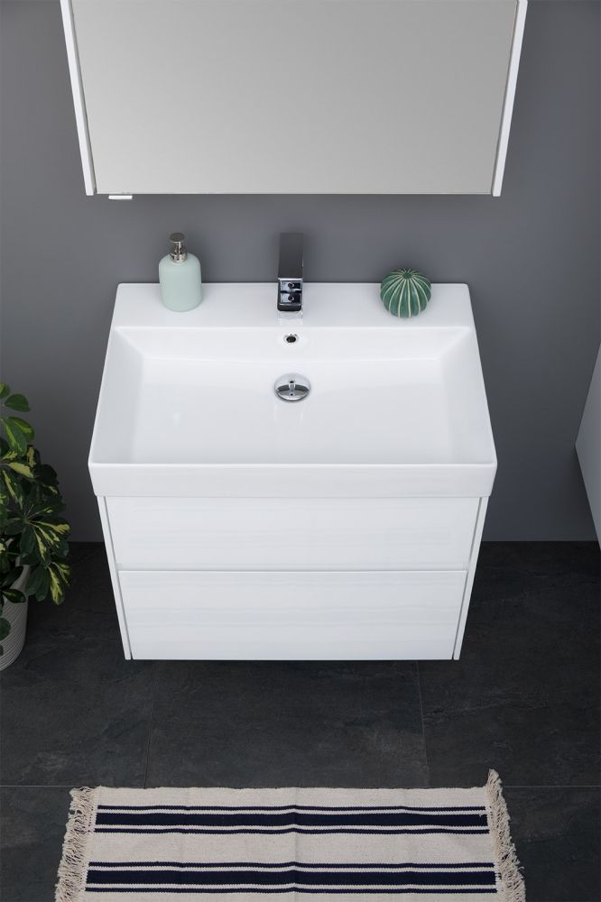 Тумба Aquanet Бруклин 60 белого цвета предназначена для подвесной установки Изделие отвечает тенденциям минимализма Аскетизм четких линий и обтекаемых форм в ней доведен до совершенства В модели нет никаких выделяющихся деталей, и даже ручки интегрированные, когда открывание происходит за счет выступающей детали верхней или нижней части фасада, которая срезана под углом, в результате чего образуется выемка, служащая ручкой В тумбе ручка устроена таким образом у верхнего ящика в нижней части фасада, а у нижнего – в верхней Такое простое решение добавляет изысканности внешнему виду изделия Раковина из керамики с тонкими изящными бортиками идет размер в размер с тумбой, ширина которой 60 см, в результате чего все изделие выглядит как единое целое Корпус изделия выполнен из выкрашенного белой краской влагостойкого ЛДСП, фасады – из МДФ На контрасте с белизной внешних деталей стильно смотрится корпус выдвижных ящиков, выполненный в цвете «дуб сонома» Нижний ящик тумбы имеет большую зону хранения, верхний разделен на несколько отделений, которые помогут грамотно разложить все необходимое по своим местам Тумба предлагается без раковины