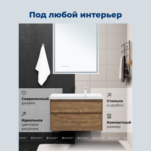 Стильная и практичная тумба для ванной комнаты с продуманной конструкцией. Модель Aquanet Nova Lite 2.0 100 выполнена в цвете дуб рустикальный – матовое покрытие имитирует фактуру натурального дерева и не оставляет отпечатков пальцев.