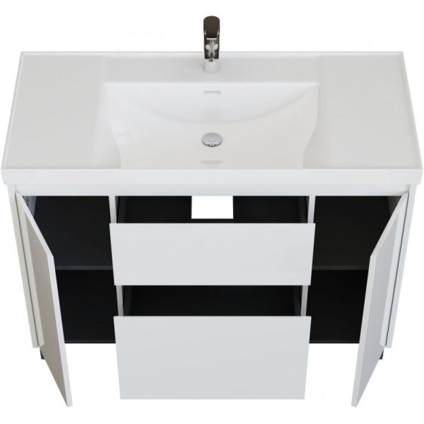Конструкция включает два выдвижных ящика посередине и две распашные дверцы по бокам. Внутреннее пространство оформлено в цвете антрацит, что придает интерьеру гармоничный вид. Пластиковое ограждение сифона в том же оттенке имеет прямоугольную форму и надежно крепится к дну ящика.