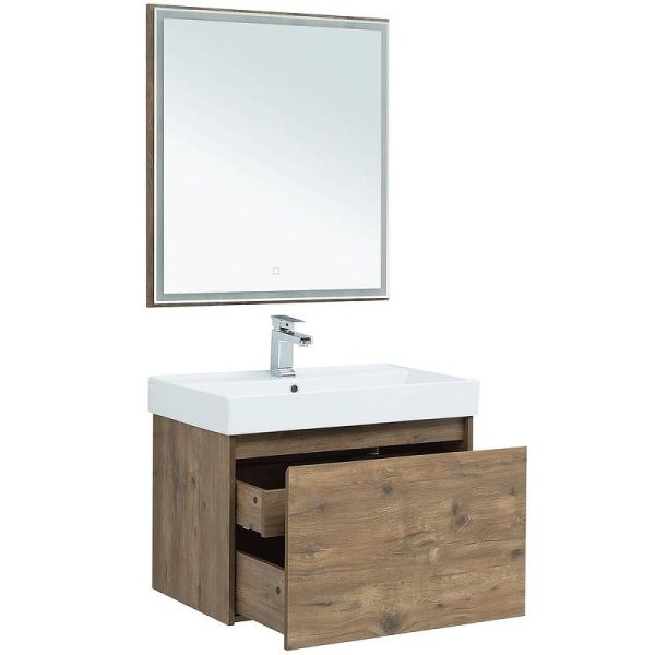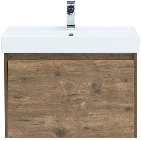 Тумба под раковину Aquanet Nova Lite 75 из влагостойкой ламинированной древесно-стружечной плиты в изысканном цвете «дуб рустикальный» имеет достойный вид. Фактура натурального дерева выглядит благородно, а подвесной монтаж придает визуальную легкость тумбе шириной 75 см. Она оборудована одним ящиком, при открывании которого обнаруживается еще один небольшой для мелочей. Фасад выполнен с декоративной интегрированной ручкой, не имеющей острых краев и внутренних углов, что обеспечивает удобство в эксплуатации и легкий уход за мебелью. Направляющие с доводчиками, так что при открывании и закрывании ящикам обеспечен плавный ход и отсутствие неприятных стуков. Неглубокая и стильная керамическая раковина «Латина» идеально подходит к тумбе.