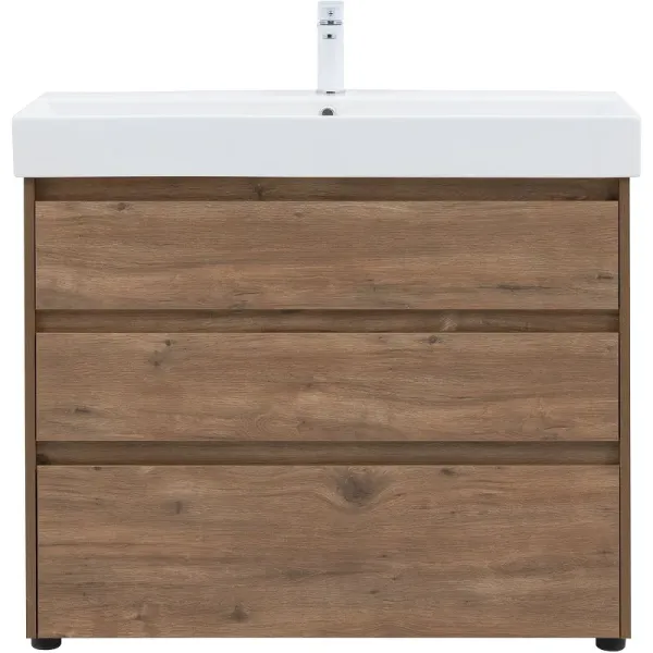 Тумба под раковину Aquanet Nova Lite 100 в дубово-рустикальном исполнении — идеальный вариант для дополнения ванной комнаты в любом из современных стилей. Лаконичный дизайн с претензией на натуральность позволяет освежить санузел смелым решением. Компактные размеры 982*825*450 мм подойдут как для малых помещений, так и для просторных. Напольная модель оснащена ножками и тремя выдвижными шкафами. Пространство внутри организовано для хранения вещей и бытовой химии с учетом коммуникаций для водоотведения. Корпус и фасад мебели изготовлены из влагостойкого ЛДСП, который препятствует образованию плесени и грибка при длительном взаимодействии с водой и влажным воздухом. Выдвижные шкафы оснащены механизмом доведения, что обеспечивает плавное закрытие. В комплект к тумбе можно купить подходящую по размерам керамическую раковину от Sanovit, например модель Slim Synergy, которая легко подсоединяется к мебели.