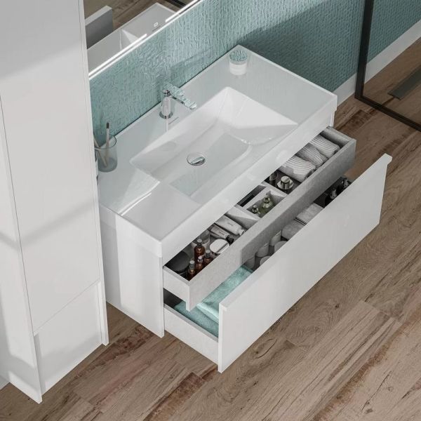 Мебель MODULA может быть использована для установки как мебельных раковин, так и любой из накладных, которые в этом случае устанавливаются на керамическую столешницу CANALETTO. Помимо основного вместительного ящика тумба оснащена внутренним ящиком-органайзером.