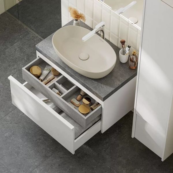 Мебель MODULA может быть использована для установки как мебельных раковин, так и любой из накладных, которые в этом случае устанавливаются на керамическую столешницу CANALETTO. Помимо основного вместительного ящика тумба оснащена внутренним ящиком-органайзером.
