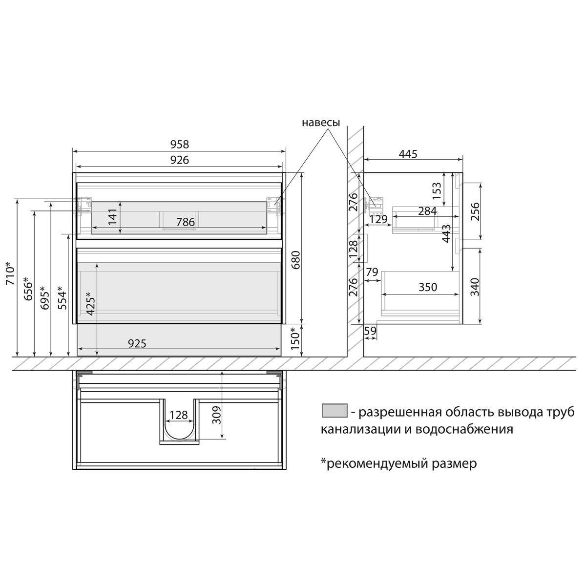 • Габариты без раковины (ШГВ): 958х445х650 мм;
