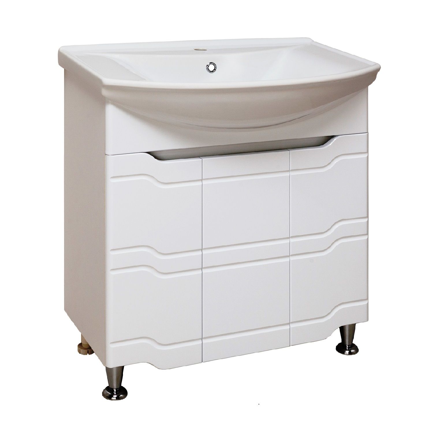 Тумба под умывальник напольная с тремя распашными фасадами и одной внутренней полкой. Петли со встроенным доводчиком, ножки хром - 2шт, ножки пластик -2шт.