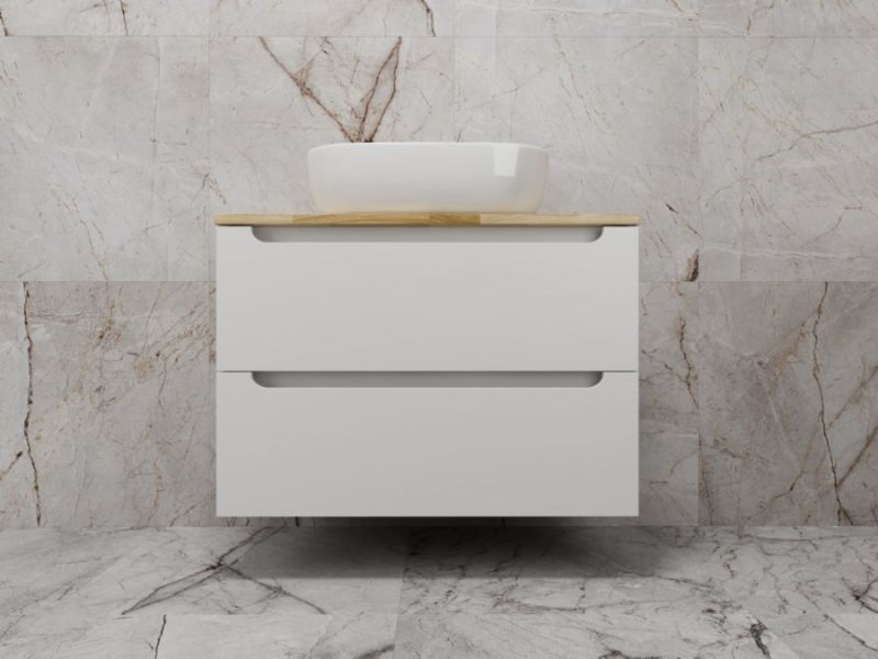 Столешница из натурального ясеня толщиной 20 мм покрыта матовым влагостойким лаком. Фасады и корпус в матовой пленке SOFT TUOCH. Внутренне наполнение из ЛДСП в декоре ГРАФИТ с эргономичным ограничителем под сифон. Фасады без ручек с лаконичным вырезом для комфортного открывания. Выдвижные ящики с системой плавного закрывания SOFT CLOSE. Экологичные и влагостойкие материалы. Легкость в уходе, практичность и стильный внешний вид.