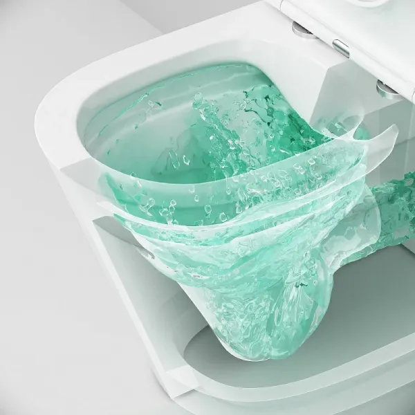 вихревой поток воды полностью очищает чашу унитаза при смыве;