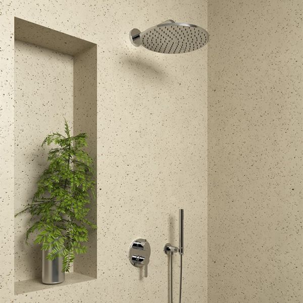 "Тропический" душ - это верхний душ, имитирующий настоящий ливень. Специальная технология подачи и распределения воды смешивает ее с воздухом, делая струи мягкими, легкими, аэрированными. А за счет широкой лейки такой душ омывает все тело. Раньше, чтобы установить верхний душ требовалось штробление стен, именно поэтому во многих квартирах установлены обычные душевые комплекты. Уникальная новинка PAINI- "тропический" душ без штробления! Душ Maggiore имеет широкую круглую лейку. Для установки верхнего душа PAINI не надо долбить стены в ванной комнате, чтобы проложить трубы. Всё делается намного проще. Этот душ состоит из кронштейна, дивертора и насадки для душа. На вход кронштейна подводится шланг от действующего смесителя, а к дивертору подключается ручная лейка.