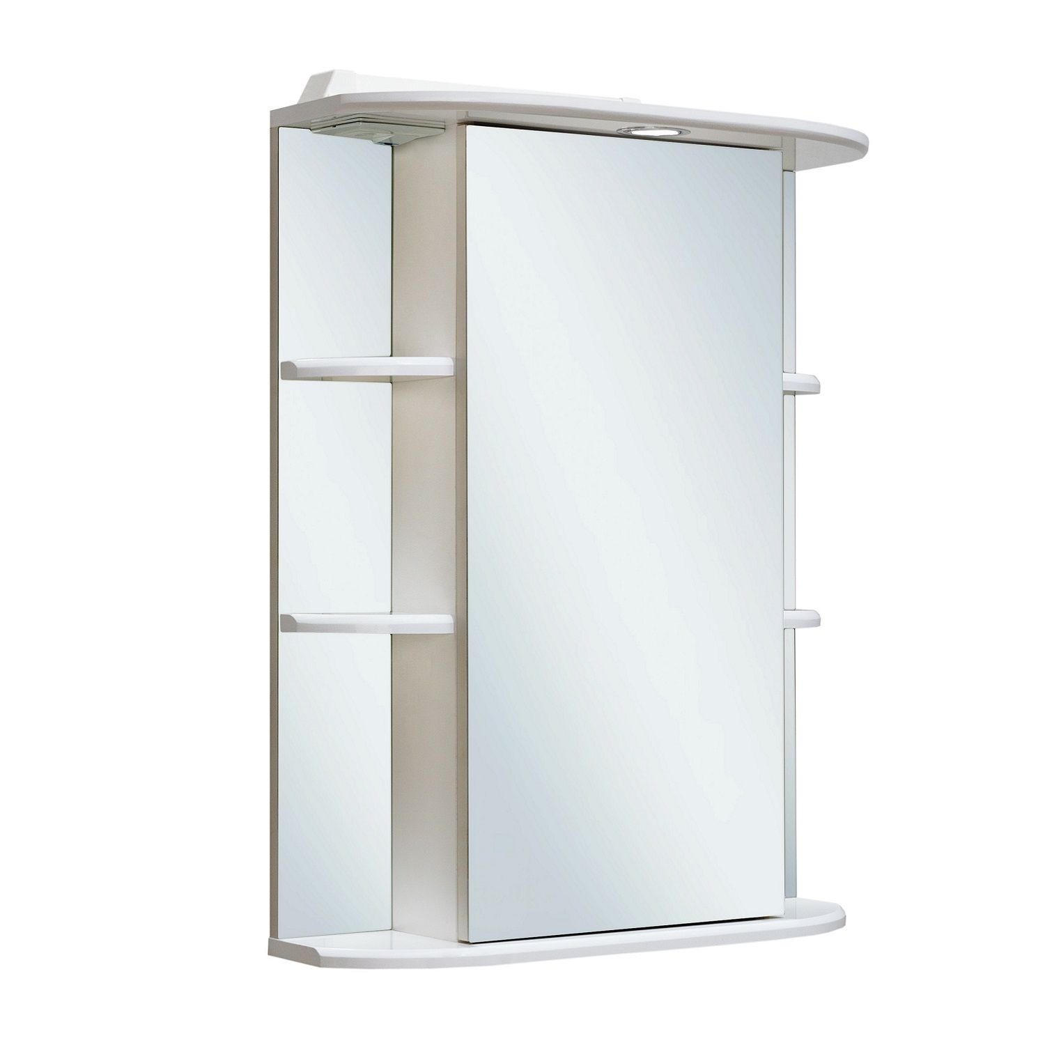 Зеркальный шкаф оборудован одним врезным светодиодным светильником 220В и розеткой с выключателем. По центру - шкаф с зеркальной дверцей и двумя внутренними полками, справа и слева -по две открытые полочки. Петли с доводчиком. Выпускается только в правом исполнении.