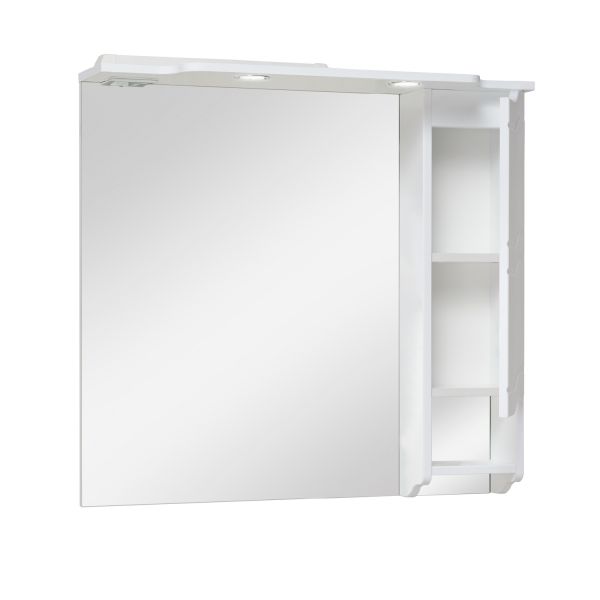 Зеркальный шкаф оборудован двумя врезными светодиодными светильниками 220В и розеткой с выключателем. Справа - шкафчик с распашной дверцей и одной внутренней полкой. Под шкафом - открытая полочка. Петли со встроенным доводчиком. Выпускается только в правом исполнении.