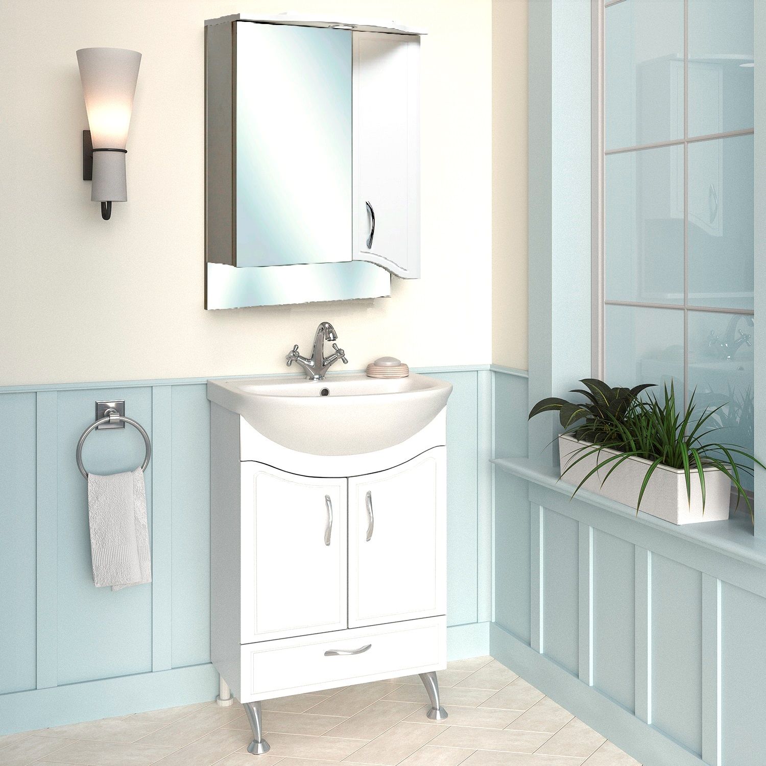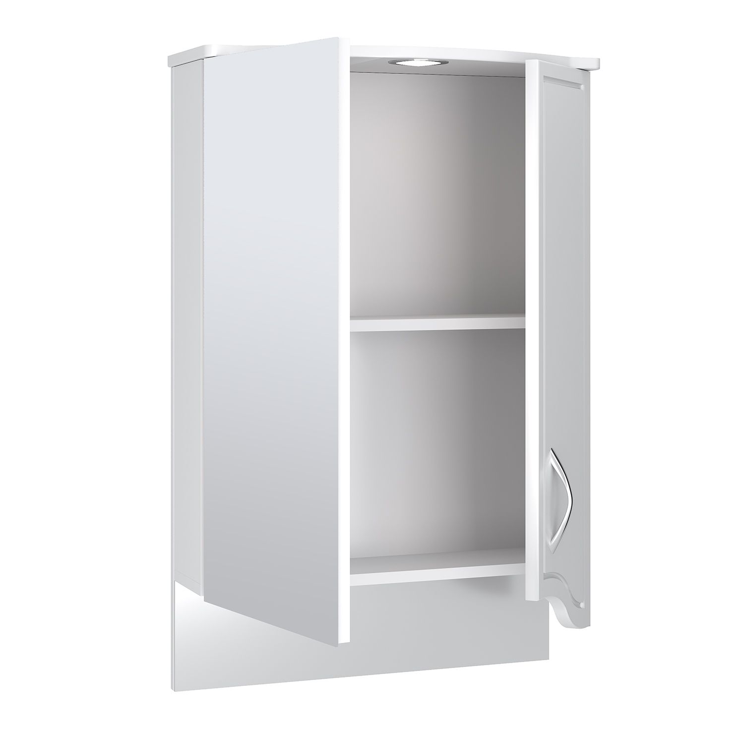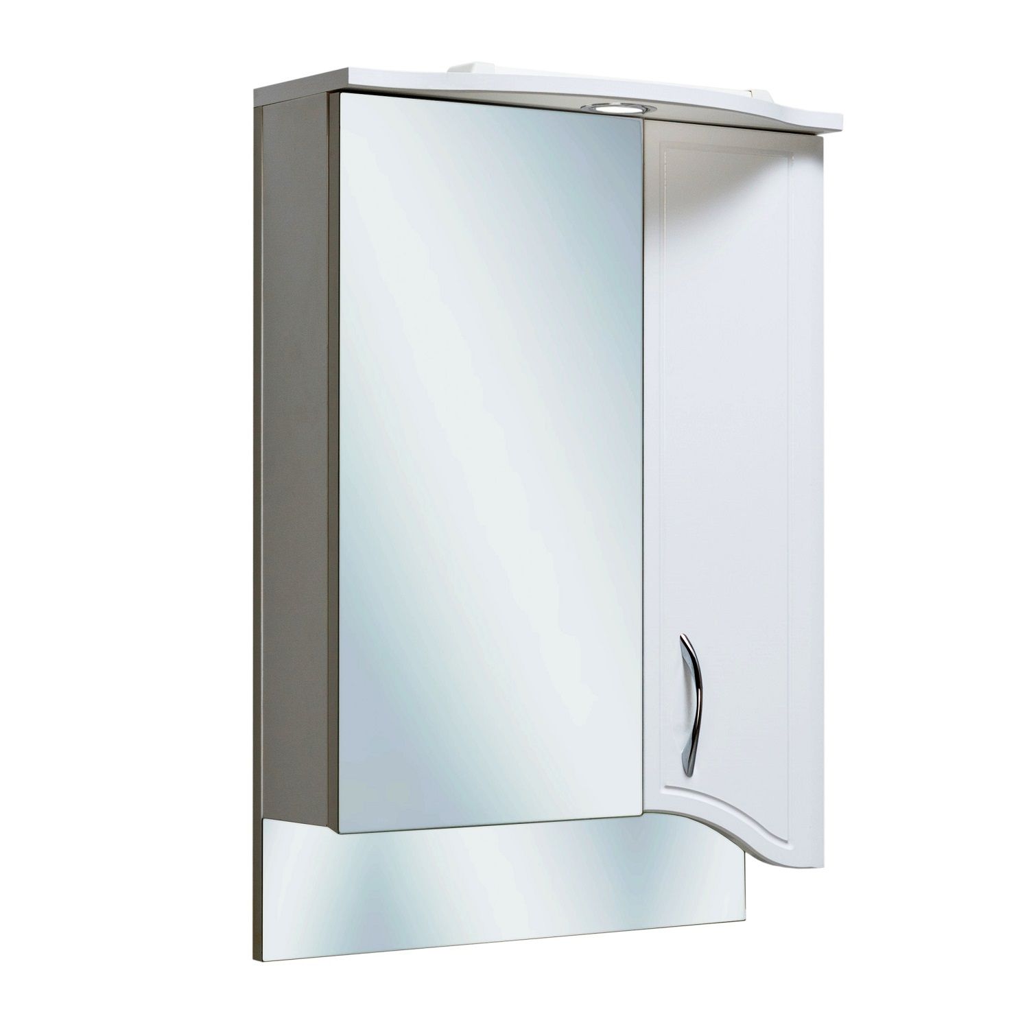 Зеркальный шкаф оборудован одним врезным светодиодным светильником и розеткой с выключателем. Шкаф с двумя отделениями: справа - с белой дверкой, слева - с зеркальной. В каждом отделении - по две внутренние полки. Петли со встроенным доводчиком, ручка -1 шт.