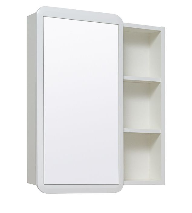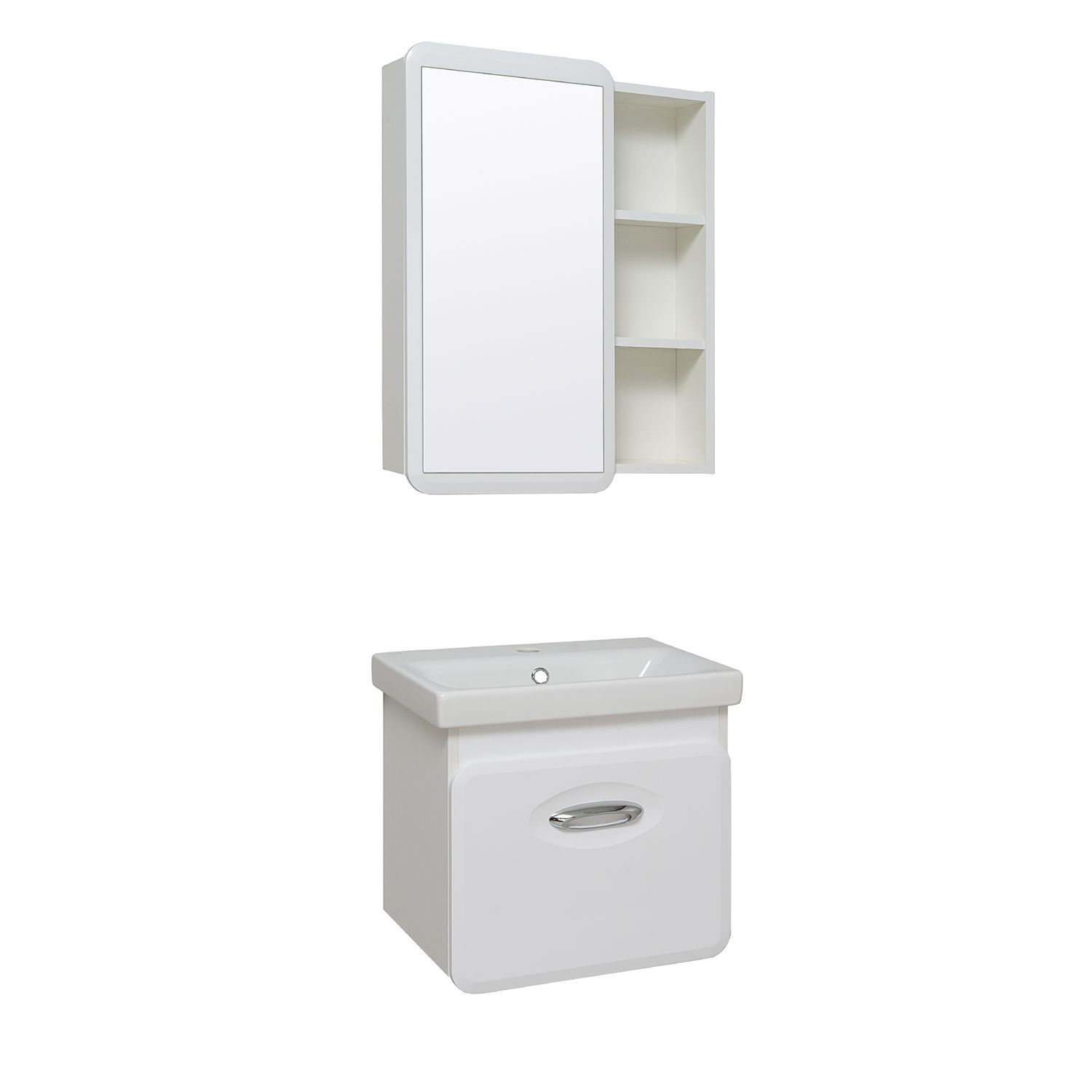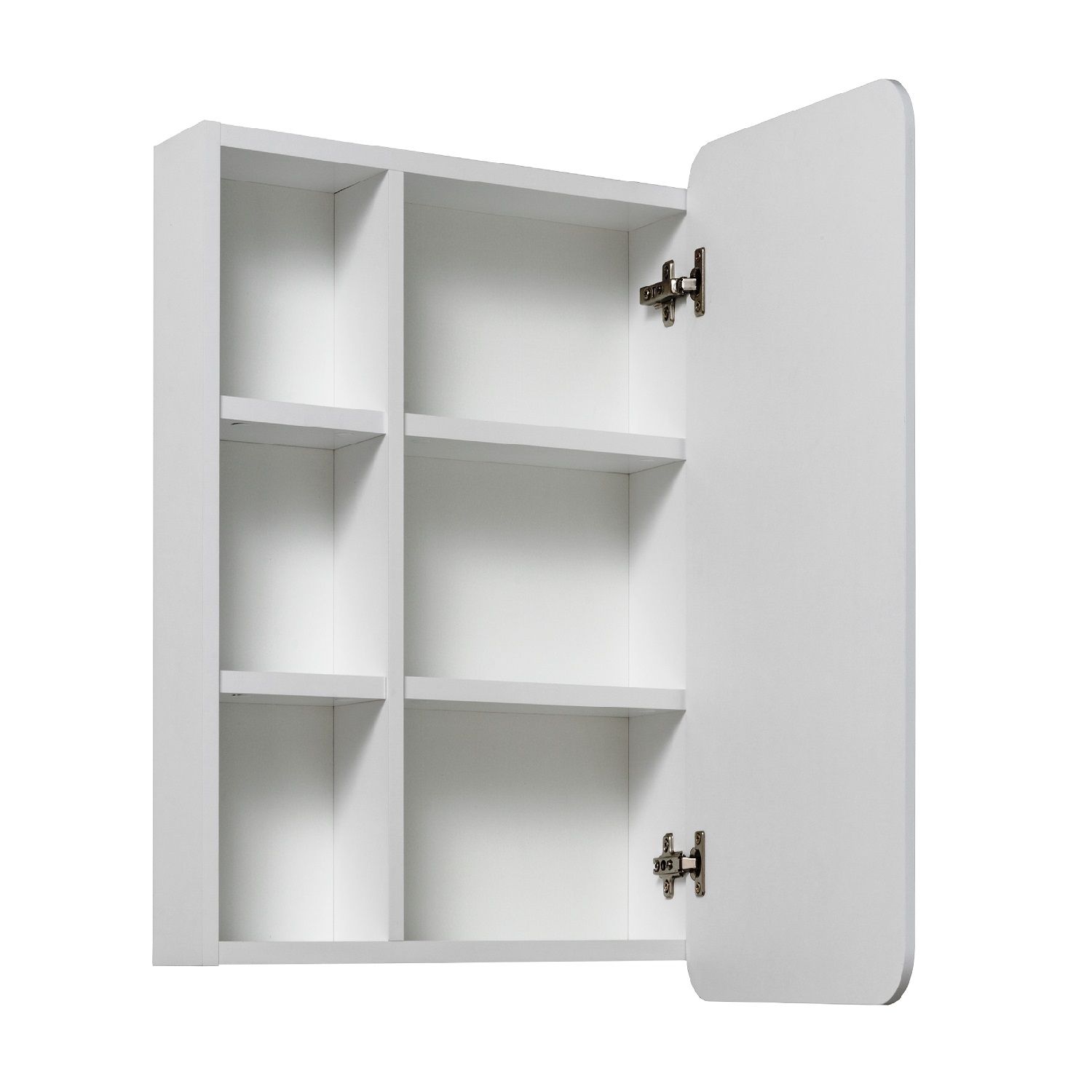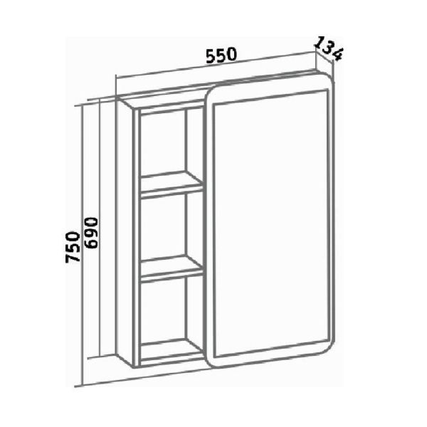 Зеркальный шкаф без подсветки с одной распашной дверкой и открытыми полками (слева или справа, зависит от установки). Внутри шкафа две внутренние полки. Петли со встроенным доводчиком. Универсальный.