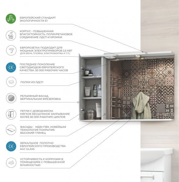 1 дверца; 2 полки ЛДСП; ручка металлическая хромированная; 1 светодиодный светильник; включатель с розеткой.