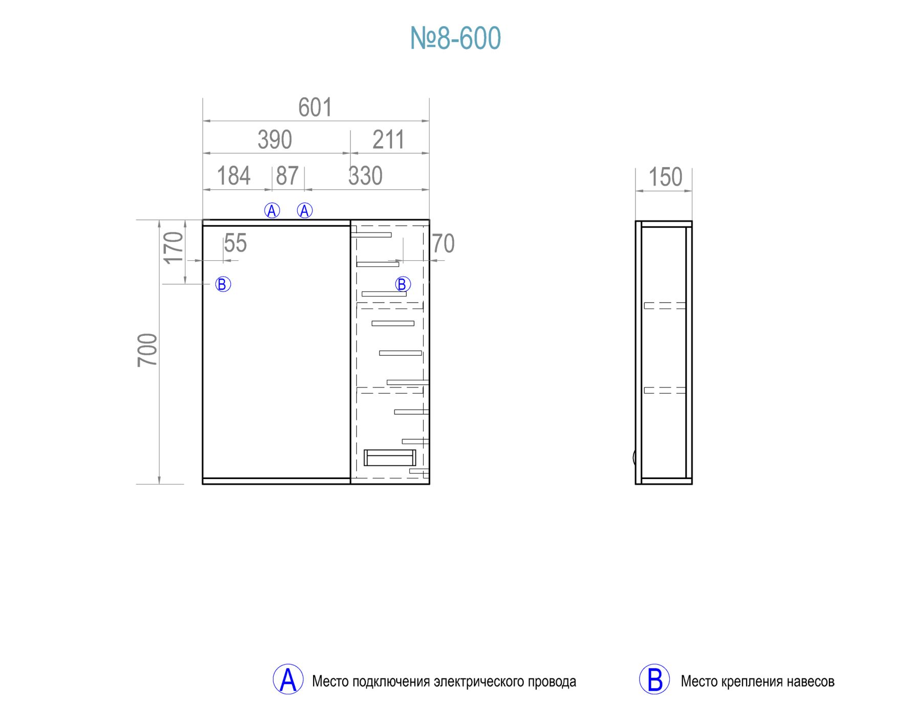 1 дверца; 2 полки ЛДСП, 1 светодиодный светильник, включатель с розеткой; ручка врезная металлическая хромированная.