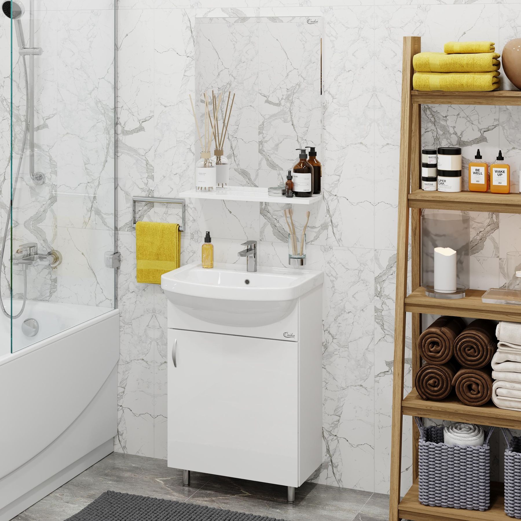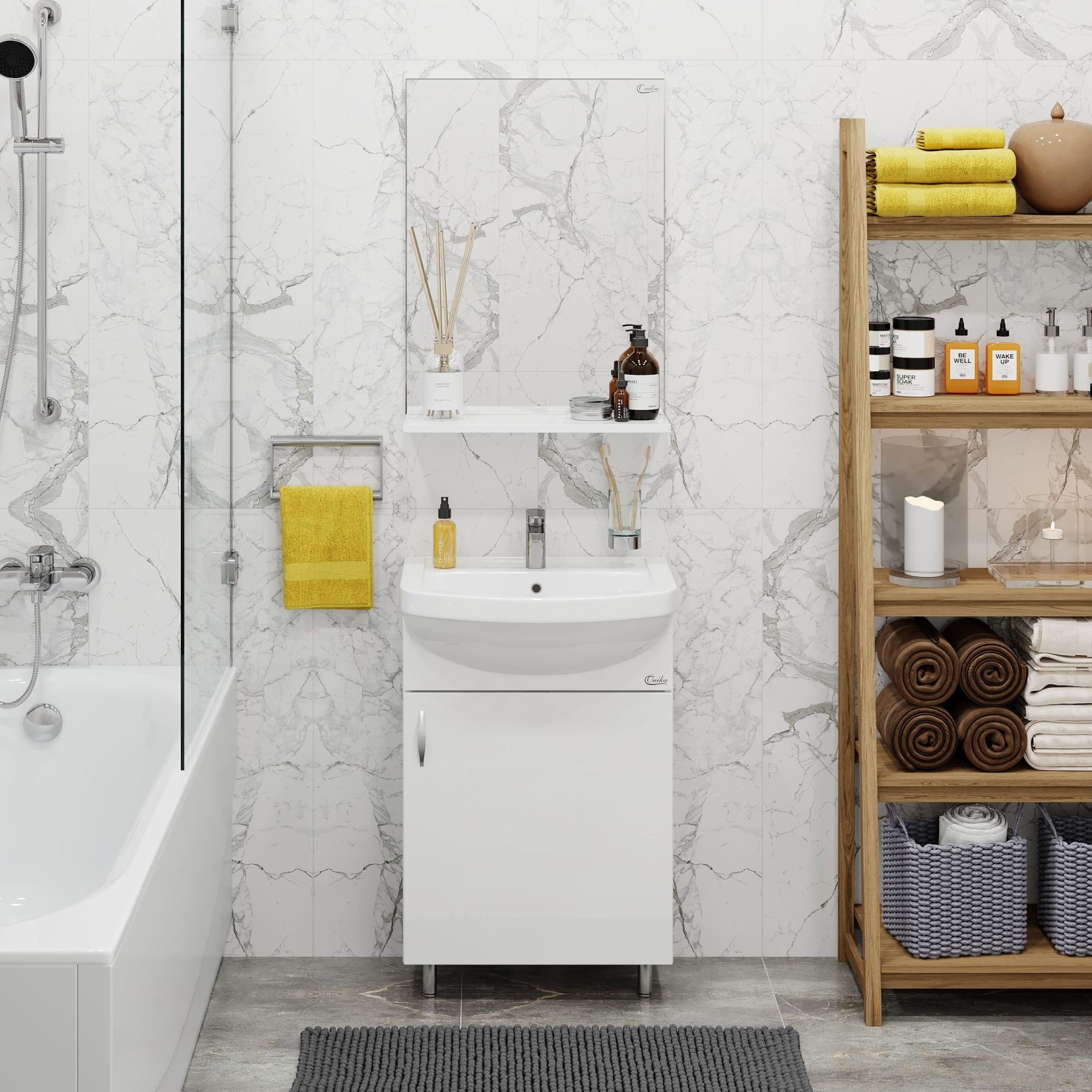 Небольшая полочка под зеркалом может быть использована для размещения декора или часто используемых предметов.