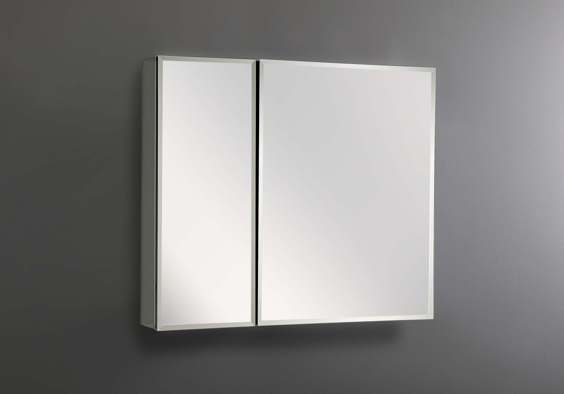 Благодаря компактным размерам и небольшой глубине такой шкаф-зеркало с дверками, которые скрывают банные предметы от глаз и пыли, будет хорошей альтернативой для тех, кто ищет небольшие полочки в ванную комнату.