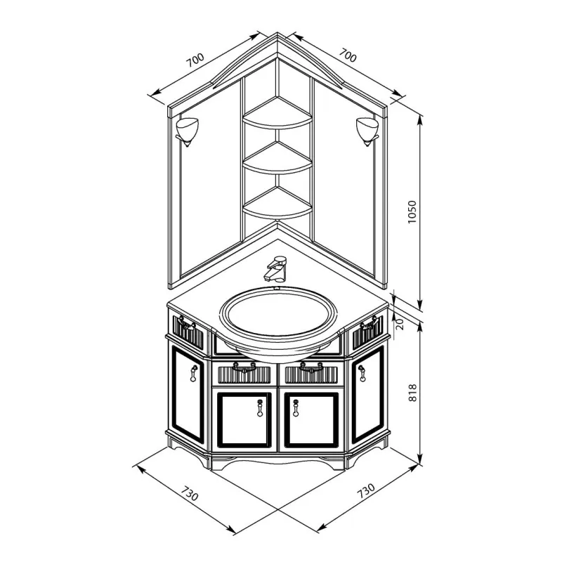 Угловое зеркало для ванной из комплекта мебели Акванет Луис выполнено в том же стиле, что и весь набор. Благодаря угловому расположению, такая модель помогает экономить пространство и эффективно использовать традиционно мало задействованные зоны. Зеркало можно укомплектовать двумя элегантными бра, заказав их дополнительно, и создать тем самым мягкое рассеянное освещение. ВНИМАНИЕ! Светильники в стоимость зеркала не входят. Их необходимо выбрать из числа рекомендованных для этой модели. Представленная на фото модель снята с продажи. Поэтому при заказе зеркала со светильниками отметьте понравившуюся модель в окне выбора, располагающемся под описанием. Для установки светильников на зеркале предусмотрены отверстия. При заказе зеркала без светильников изделие будет выполняться на заказ, и срок его изготовления составит 2-4 недели.